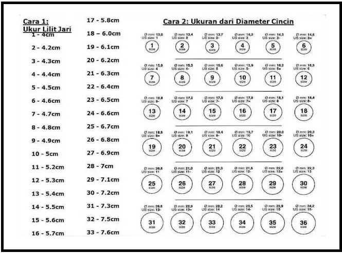Langkah 3 : Lihat pada carta ukuran dan bandingkan saiz diameter dengan saiz cincin.